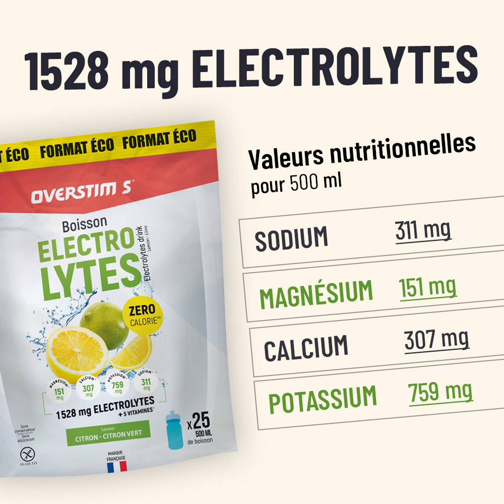 Priva di apporto calorico (4 kcal / 100 ml), la bevanda elettrolitica OVERSTIM.s consente di rifornire gli elettroliti (sali minerali) persi con il sudore.