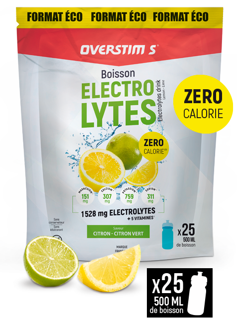 Priva di apporto calorico (4 kcal / 100 ml), la bevanda elettrolitica OVERSTIM.s consente di rifornire gli elettroliti (sali minerali) persi con il sudore.